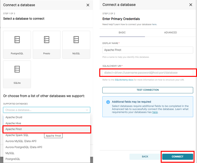 pinot을 선택하고, SQLALCHEMY URI 란에 아래 주소를 입력한다.